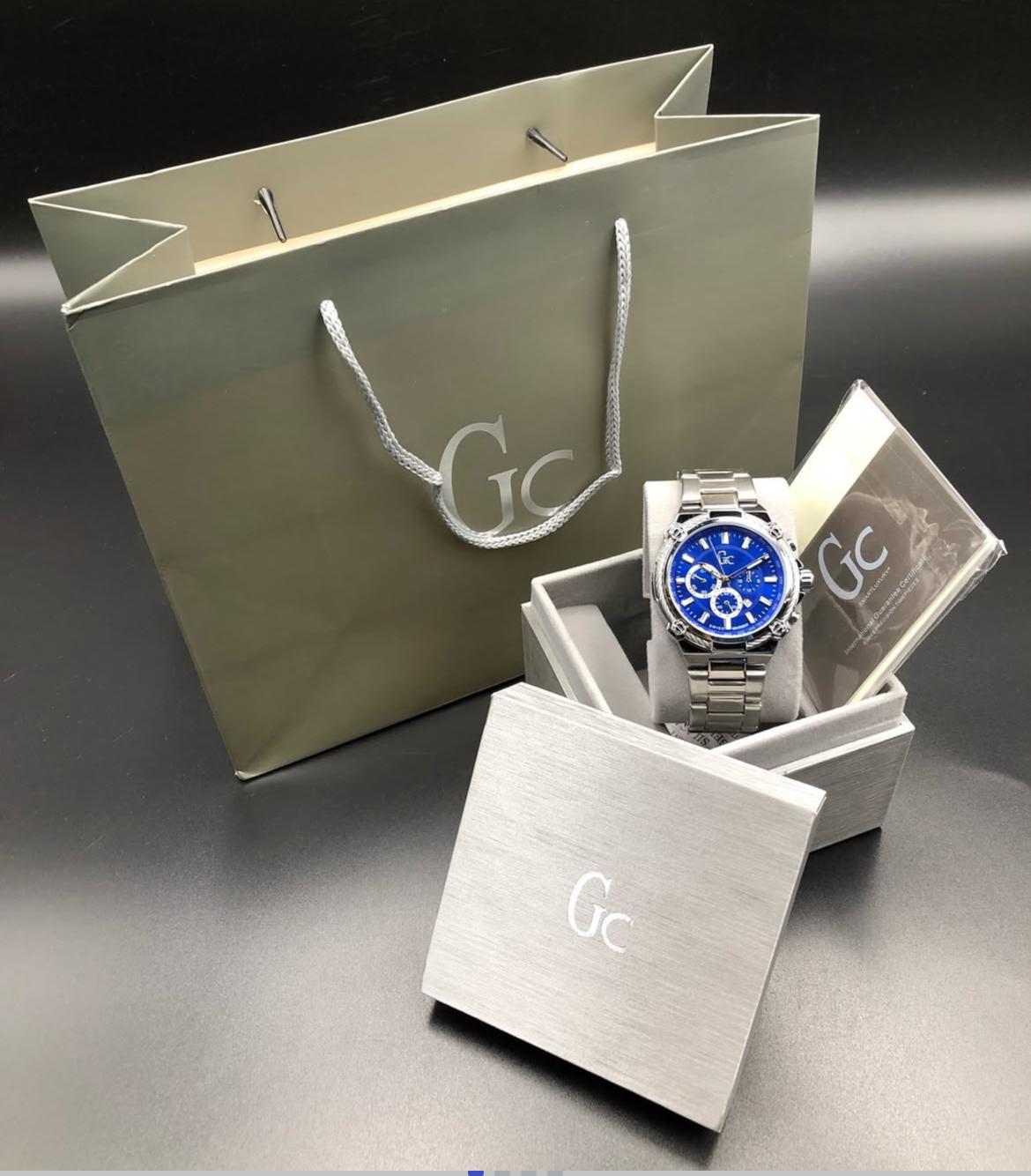 ساعة GC بقرص أزرق لامع وسوار ستيل فضي مصقول. هيئة قوية، تفاصيل دقيقة، وإطلالة تكمّل أي لوك رسمي أو كاجوال — بثمن استثنائي اليوم فقط.